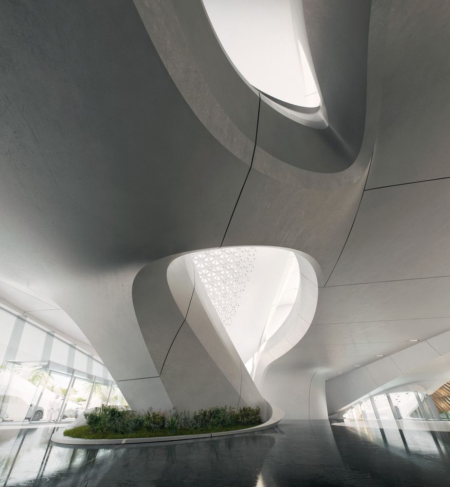 建筑的南侧借幕墙的镜面反光消隐于自然